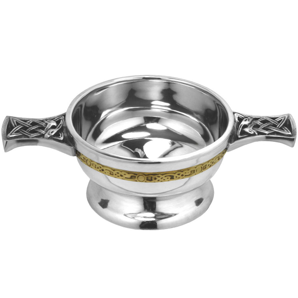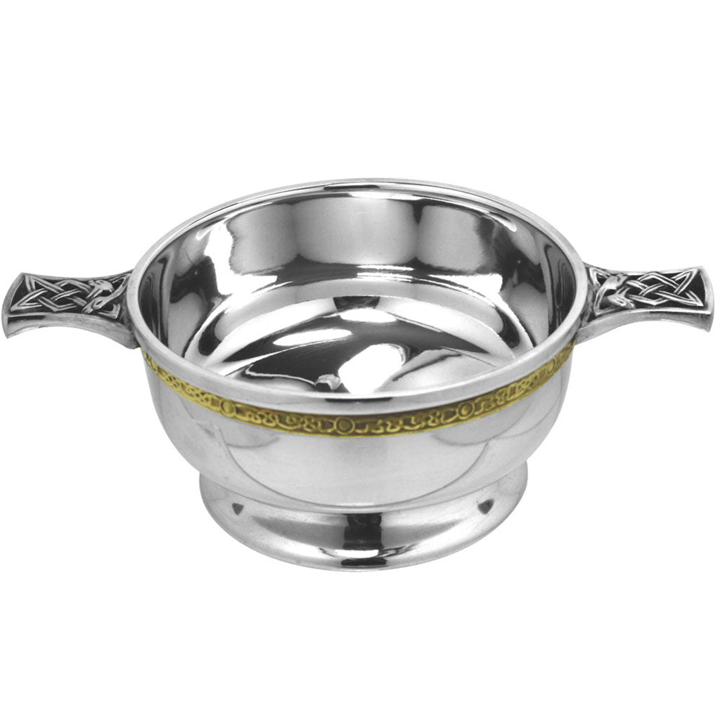 English Pewter Company ist zu Recht stolz auf die traditionellen und eleganten Artikel in unserem Zinnsortiment, und einige dieser Artikel, die diese traditionelle Eleganz besser als alle anderen ausstrahlen, sind zweifelsohne unsere Auswahl an Zinn-Quaich. Dieser schöne Zinn-Quaich hat eine schlichte, hochglanzpolierte Schale, die in wunderbarem Kontrast zu den verzierten Griffen im Stil des keltischen Knotens und den keltischen Bändern um den Umfang der Schale steht. Die Geschichte des Quaichs reicht Jahrhunderte zurück und ist allgemein als schottischer "Willkommensbecher" bekannt, bei dem Besucher mit Whisky und Getränken von jeder Seite der Schale begrüßt wurden. Heute wird er als Erinnerungsgeschenk für Hochzeiten, Taufen und eine ganze Reihe von Feiern verwendet, insbesondere für Menschen mit schottischem Erbe. Die Schale eignet sich perfekt für die Anbringung einer persönlichen Nachricht durch unseren fachmännischen Gravurservice, falls Sie dies wünschen. Diese Schale hat einen Durchmesser von 3,5" oder 90 mm (ohne Griffe). Jeder Quaich wird elegant in unseren exklusiven cremefarbenen und schwarzen Scottish Piper-Geschenkboxen geliefert, wie abgebildet.
