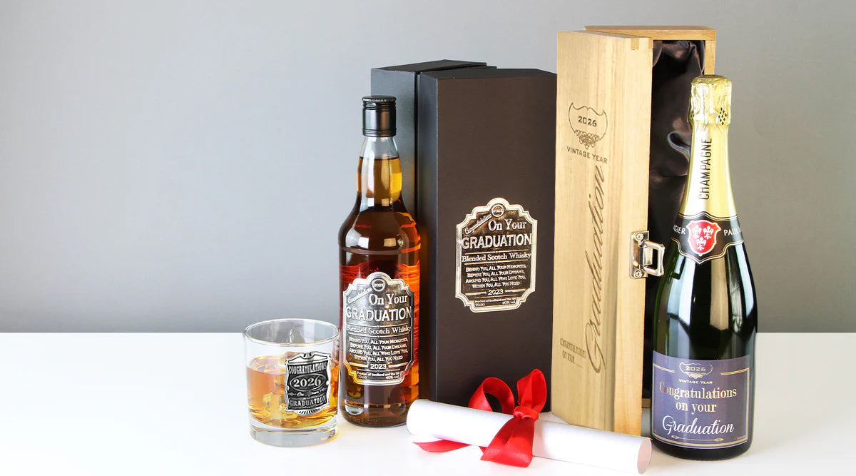 Our fabulous collection of luxury personalised graduation gifts are perfect for those looking for that unique keepsake gift as reward for the many years of work, dedication and sacrifice by a friend or loved one. From personalised Champagne, to stunning glasses, we’re sure you will find that special keepsake gift for them on their big day. We also offer the option to have most of our fabulous items personalised with the option of engraving, to make your gift extra special and personal.